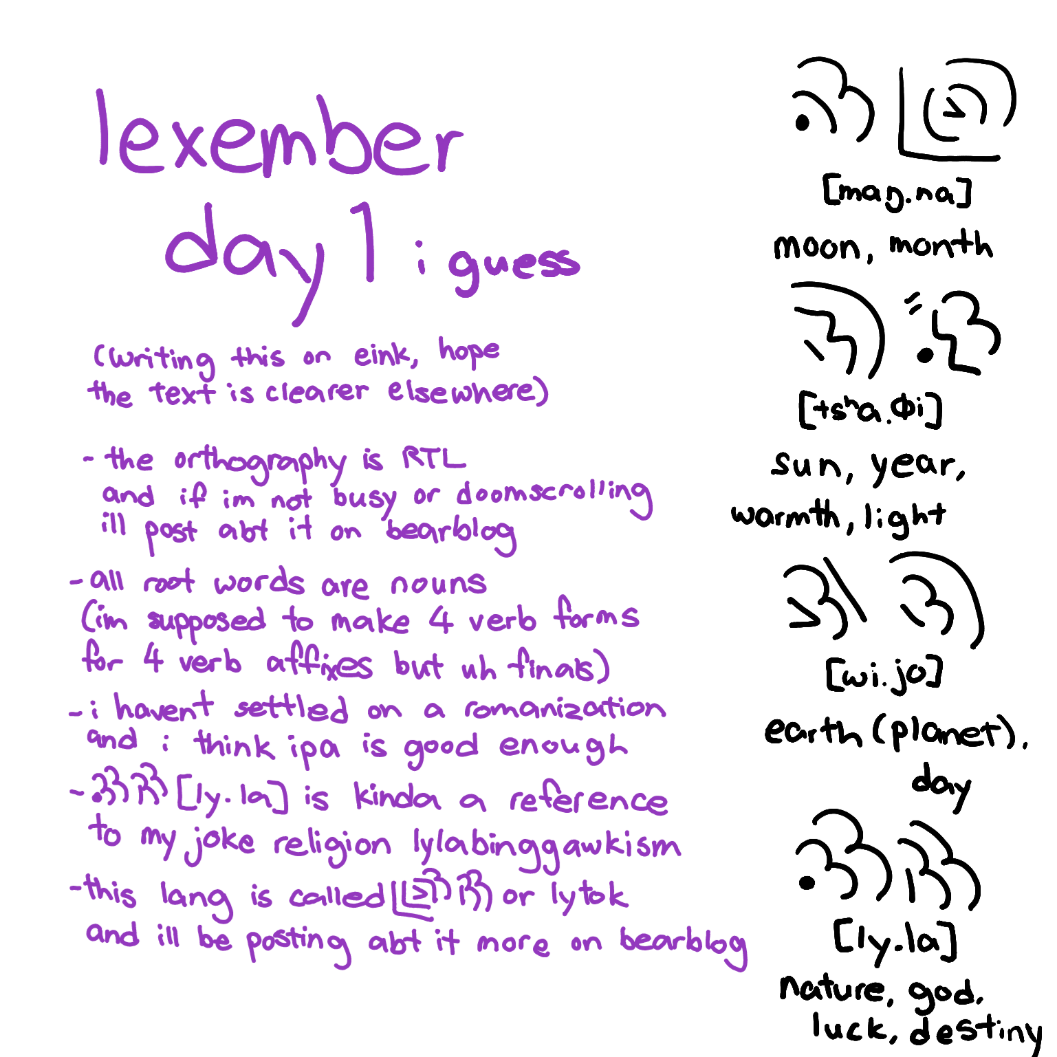 a few weeks ago ive been informed its lexember. for those who dont know lexember is when ppl make one word for their conlang every day in december, i learned that recently and i am working on a conlang tho not that much cuz finals prep, but one word? heck i can do 3 words when im bored at school, cuz my clong lytok does not have enough words. today i made four